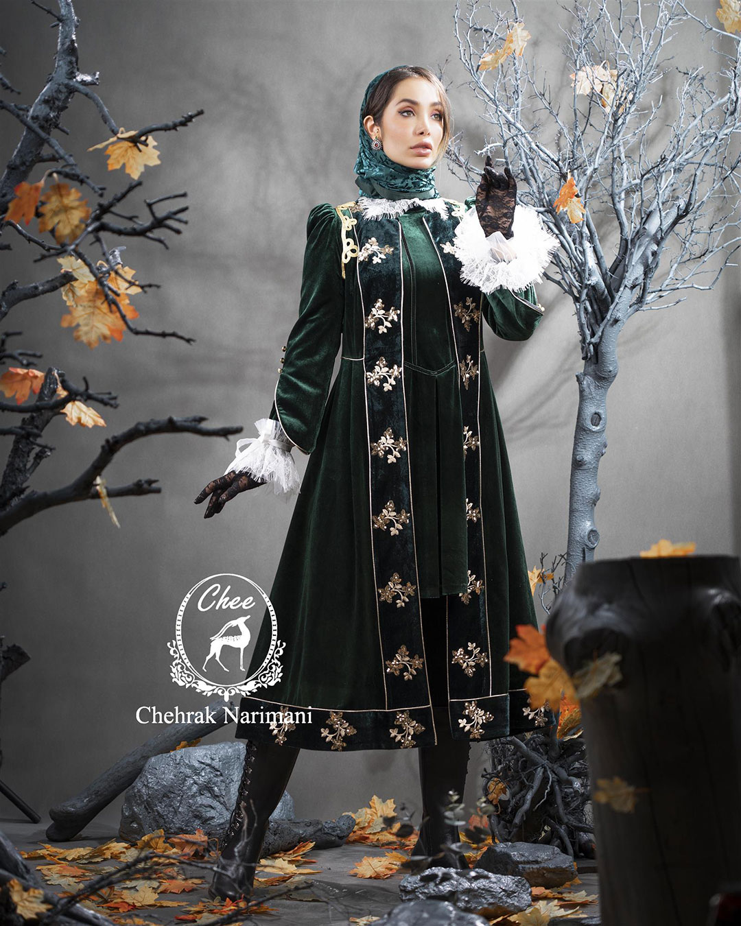 جنس مخمل کره و گلدوزی با ملیله های خیلی ریز و و آستردار میباشد. پیراهن مخمل نواردوزی شده و دامن آستردار و گیپورهای فرانسوی است.